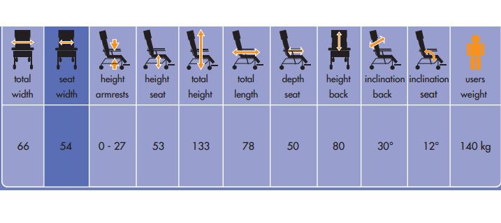 wyposażony jest w regulacje pochylenia siedziska i oparcia, która dostępna jest zarówno dla osoby siedzącej i opiekuna.